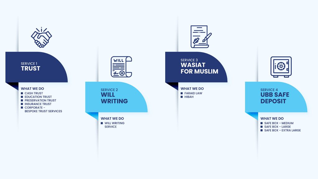 UBB Cast Trust is a trust that you establish in which you deposit funds that can be made available to your specified beneficiaries in the event of an emergency. It provides rapid cash for expenses and relief during times of crisis. UBB Amanah is the first to establish the Cash Trust, which is now imitated by competitors.